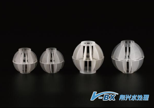 多面空心球采用聚丙烯(PVC)塑料制成球狀,由兩個半球合成一個球形,每個半球上開有12個半扇形葉片,兩個半球的扇形葉片相互錯開。該填料特點是比表面積大,空隙率較高。但是由于葉片數偏多,彼此間有遮蔽效應,不利于液體分布和潤濕;液體大多在球體空心柱聚集,阻礙氣體暢通,因此阻力較大。此種填料多用于水處理工程。