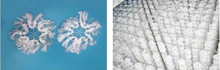 組合式填料集軟性和半軟性填料之優點,克服了兩者的弊端,在污水的生化處理過程中為較理想的產品。它是有塑料環為依托作為骨架,負載著維綸絲,維綸絲緊固在塑料環上,在污水中絲束分布均勻,易生膜、換膜,并對污水濃液的適應性好,廣泛應用于各種污水及廢水處理。