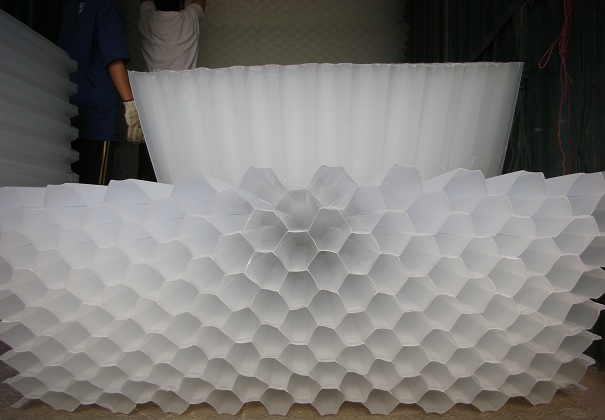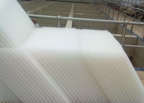 3、如果不及時操作,水質會惡化、發臭、變黑。冷卻塔內有大量污垢,大大降低了冷卻散熱效果,加重了腐蝕。因此,有必要使用殺菌劑來控制微生物的繁殖。此外日曬對塑料材料的傷害也很大,更容易加速老化,所以斜管填料不能直接堆放,需要長時間保持在水中,避免紫外線照射。